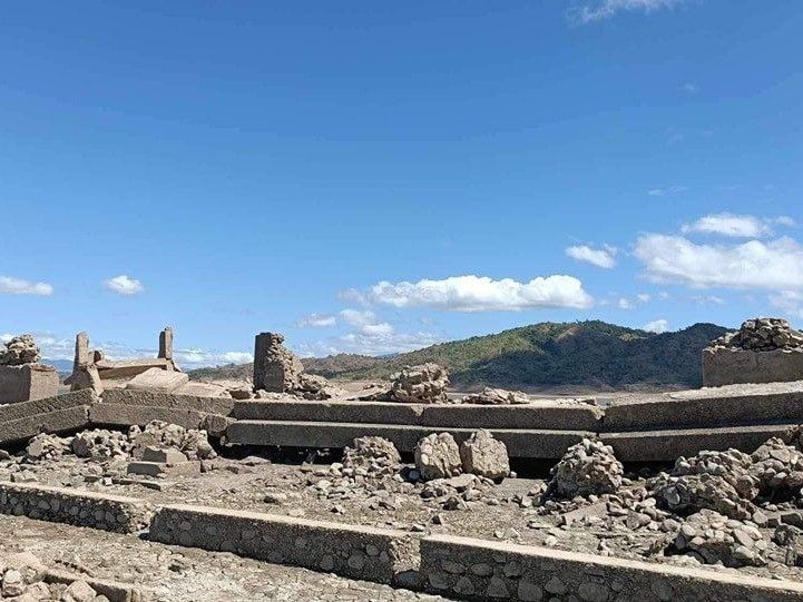 Dopo un periodo prolungato di caldo intenso e un po' di pioggia, il livello dell'acqua nella diga è sceso fino a rivelare parti di una chiesa sommersa, pietre tombali e le fondamenta di strutture della città di 300 anni fa nella provincia di Nueva Ecija.