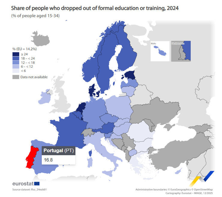 Secondo il Jornal de Negócios, i dati Eurostat del 2024 mostrano che in Portogallo il 16,8% dei giovani ha abbandonato la scuola, in contrasto con Paesi con tassi di abbandono più elevati, come i Paesi Bassi (32,2%) e la Danimarca (27,1%). D'altra parte, Paesi come la Romania (1,5%), la Grecia (2,2%) e la Bulgaria (3,5%) hanno tassi molto più bassi. L'abbandono scolastico in Portogallo si verifica a tutti i livelli di istruzione e riflette sia difficoltà accademiche che motivi personali.