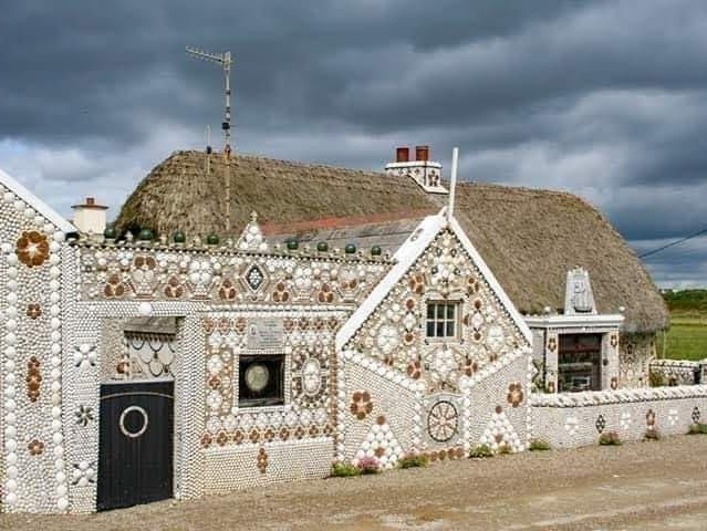 The cottage has a quaint thatched roof, and the seashells make up various patterns. Above the door is a mosaic of The Mexico, a ship that crashed ashore on one of the Keeragh Islands off the Wexford coast in 1914.